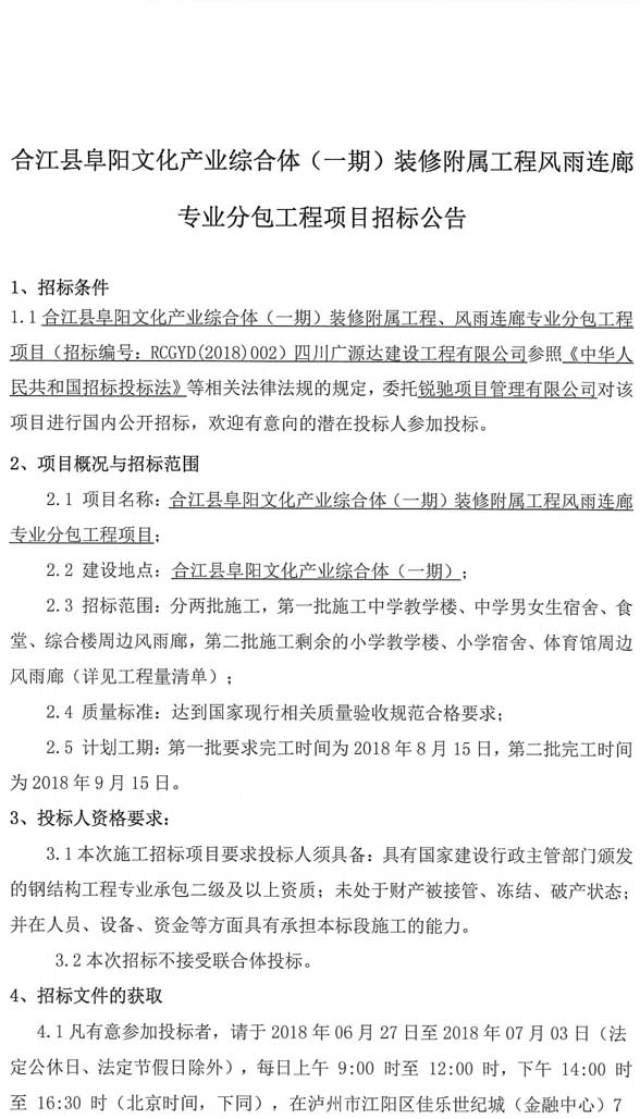 合江縣阜陽(yáng)文化產(chǎn)業(yè)綜合體(一期)裝修附屬工程風(fēng)雨連廊專業(yè)分包工程項(xiàng)目招標(biāo)公告.doc