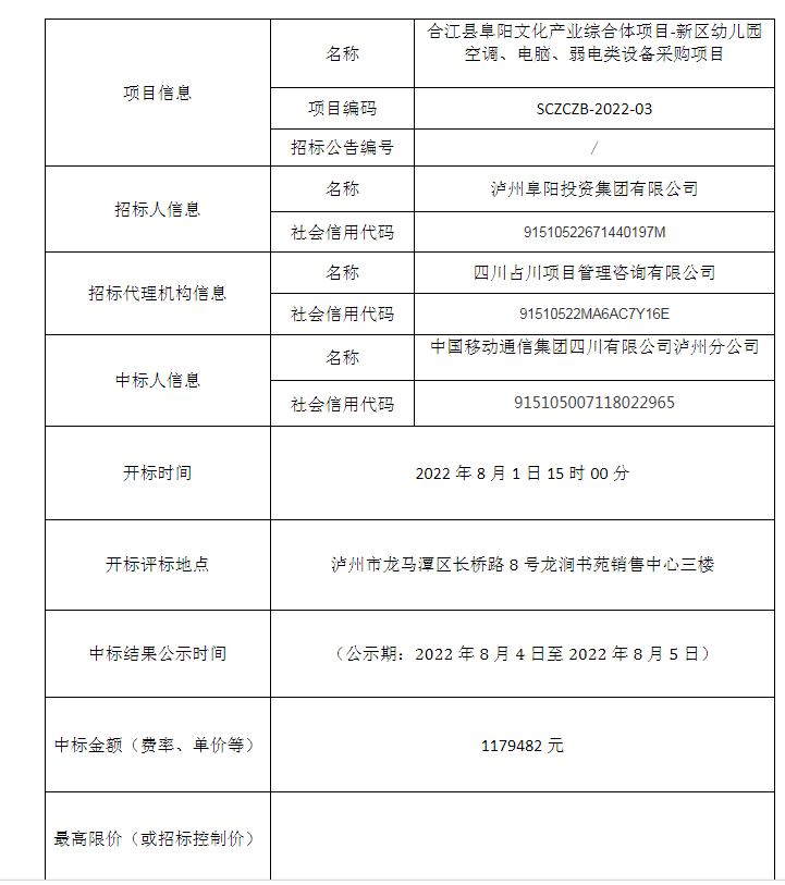 合江縣阜陽文化產(chǎn)業(yè)綜合體項(xiàng)目-新區(qū)幼兒園空調(diào)、電腦、弱電類設(shè)備采購(gòu)項(xiàng)目公開招標(biāo)中標(biāo)結(jié)果公告